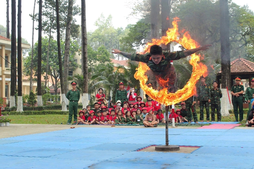 | Chiến sĩ Trung đoàn Gia Đình biểu diễn kỹ thuật nhảy qua vòng lửa, để lại nhiều ấn tượng đối với các bé, phụ huynh và nhà trường. |