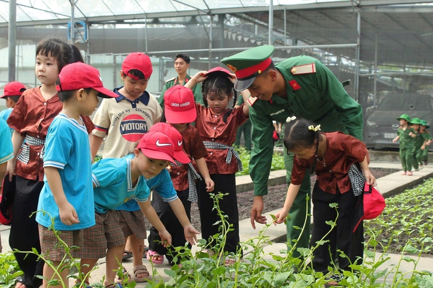 | Các cháu học sinh Trường Mầm non Âu Cơ thăm vườn tăng gia sản xuất của bộ đội Trung đoàn Gia Định. |