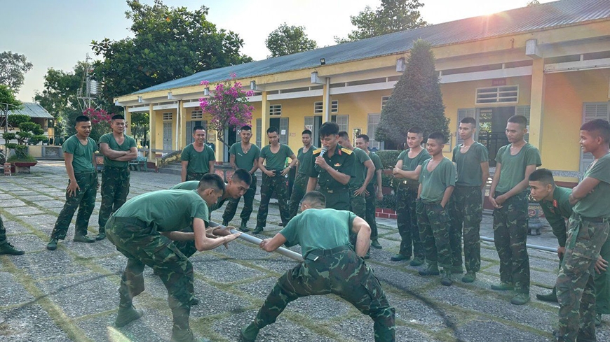 | Cán bộ, chiến sĩ Ban Chỉ huy PTKV 1 - Bến Lức (Bộ CHQS tỉnh Tây Ninh, Quân khu 7) giao lưu cùng đoàn viên thanh niên địa phương. |
