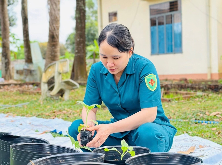 | Tranh thủ ngày nghỉ, nữ chiến sĩ dân quân Ban CHQS xã Đồng Phú (Bộ CHQS tỉnh Đồng Nai, Quân khu 7) chăm sóc hoa Tết. |