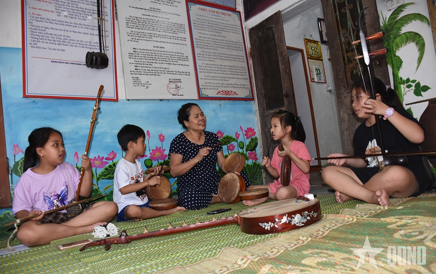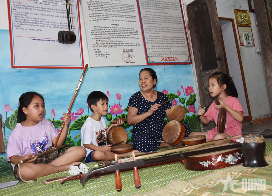 Bà Nguyễn Thị Mận (con gái cụ Hà Thị Cầu), Chủ nhiệm Câu lạc bộ hát xẩm Hà Thị Cầu truyền dạy hát xẩm tới các em nhỏ. |