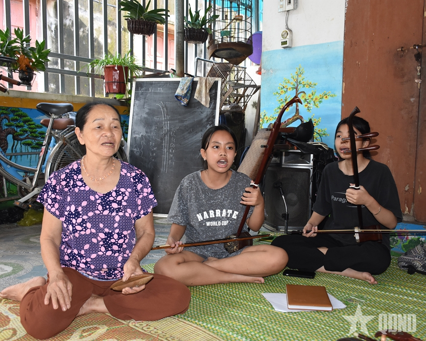 Cô Mai Thị Sách (ngoài cùng, bên trái) tích cực tham gia truyền dạy hát xẩm. |