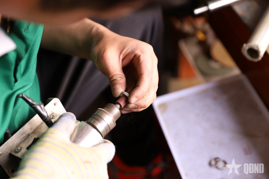 | Sau các bước tạo hình thô, người thợ tỉ mỉ chà nhám và đánh bóng lại bề mặt bạc bằng máy mài cầm tay. Công đoạn này giúp loại bỏ mọi vết thô ráp, đảm bảo mỗi chiếc nhẫn hay vòng tay khi đến tay người dùng đều đạt độ mịn và sắc nét hoàn hảo nhất. |