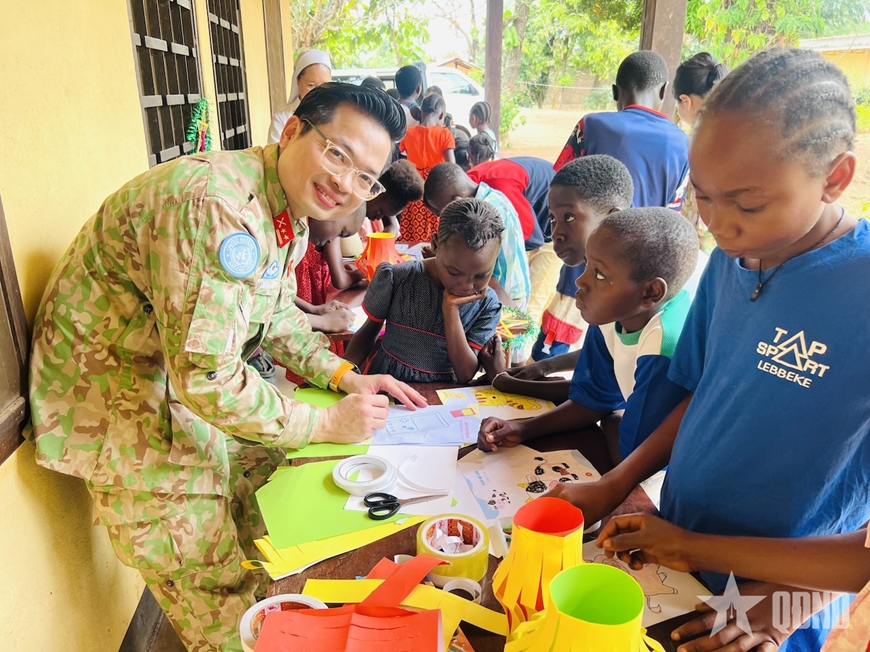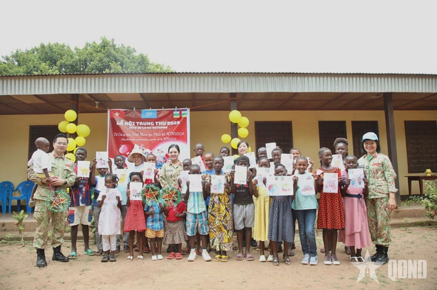 Phát biểu khai mạc chương trình, Trung tá Duy Văn Sơn, Tổ trưởng Tổ công tác Bộ Quốc phòng Việt Nam tại Phái bộ MINUSCA chia sẻ: “Chúng tôi mong muốn mang đến cho các em nhỏ Trung Phi không chỉ niềm vui trong dịp Tết trung thu, mà còn lan tỏa tinh thần nhân ái và văn hóa truyền thống của Việt Nam - nơi trẻ em luôn được yêu thương, quan tâm và dành những điều tốt đẹp nhất".