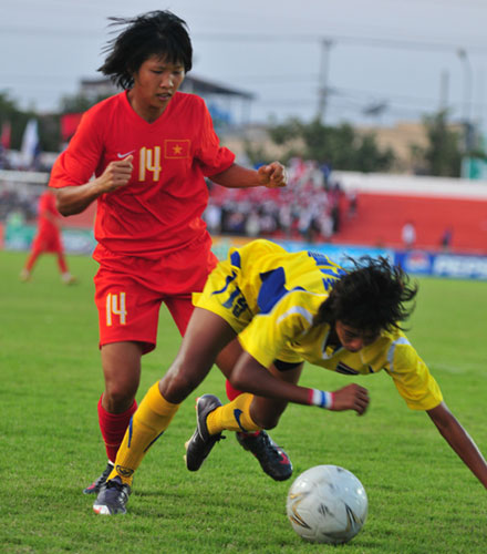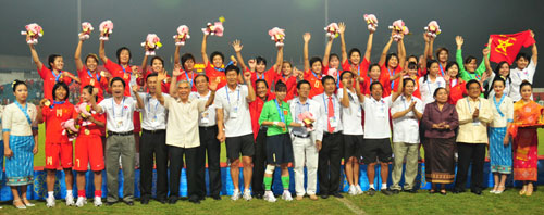 QĐND Online - Sau 120 phút hai thi đấu căng thẳng, quyết liệt hai đội bước vào loạt sút 11m đầy may rủi, các cô gái Việt Nam đã giành chức vô địch bóng đá nữ SEA Games 25 trong niềm vui chiến thắng vỡ oà của cổ động viên Việt Nam ở sân vận động Chao Anu-Vong cũng như người hâm mộ ở quê nhà. Chiến thắng của đội tuyển nữ Việt Nam trước đội tuyển Thái Lan là rất xứng đáng với những gì họ đã thể hiện. Đó là tinh thần thi đấu quả cảm, quyết tâm cao độ của đoàn tuyển thủ nữ Việt Nam.