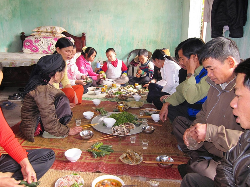 Nhang tàn, mâm cơm được dọn xuống trải trên ba chiếc chiếu hoa cói nối dài giữa nền nhà. Hoa văn đỏ xanh đã nhạt theo năm tháng, nhưng sợi cói vẫn bền chắc. Đại gia đình quây quần, chân chạm chân, vai kề vai. Chén rượu quê sóng sánh chuyền tay. Những lời chúc mộc mạc: “Sang năm mạnh khỏe”, “Làm ăn thuận lợi”, “Gia đình hòa thuận”... nghe sao mà ấm lòng đến thế.