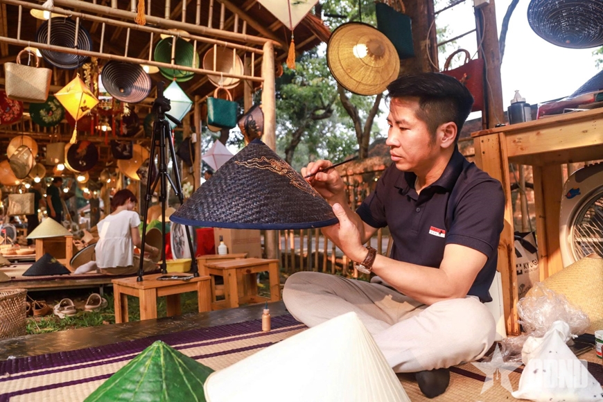 Vừa giới thiệu sản phẩm cho khách tham quan, anh Kính vừa chia sẻ: “Chúng tôi trưng bày nón lá với mong muốn nhiều người hiểu hơn về nghề truyền thống. Mỗi chiếc nón đều được làm thủ công, trải qua nhiều công đoạn nên khi thấy mọi người quan tâm, yêu thích, bản thân tôi cũng rất tự hào”.