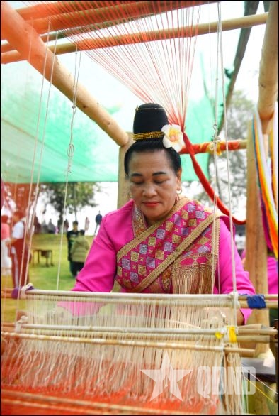 | Nghệ nhân trình diễn dệt vải bằng khung cửi với hoa văn truyền thống của đồng bào dân tộc Lào. |