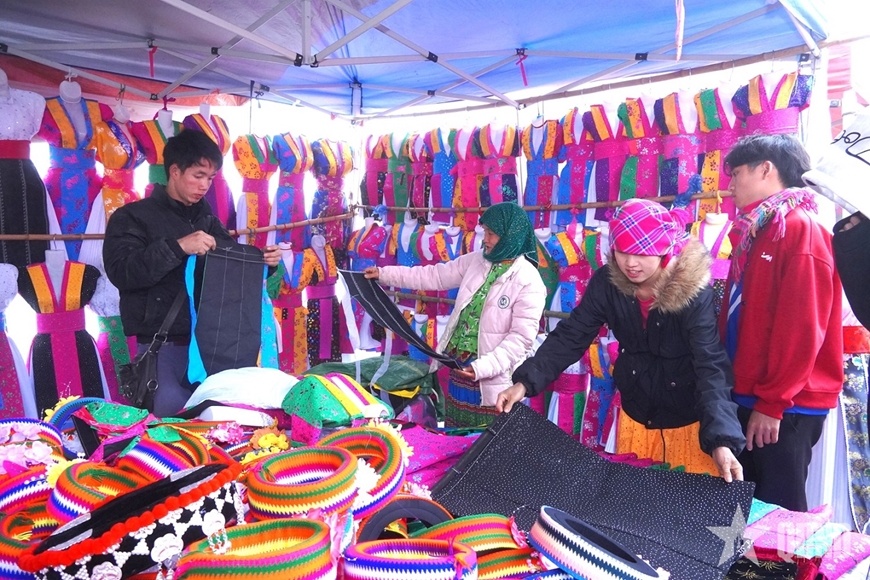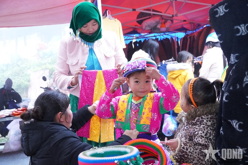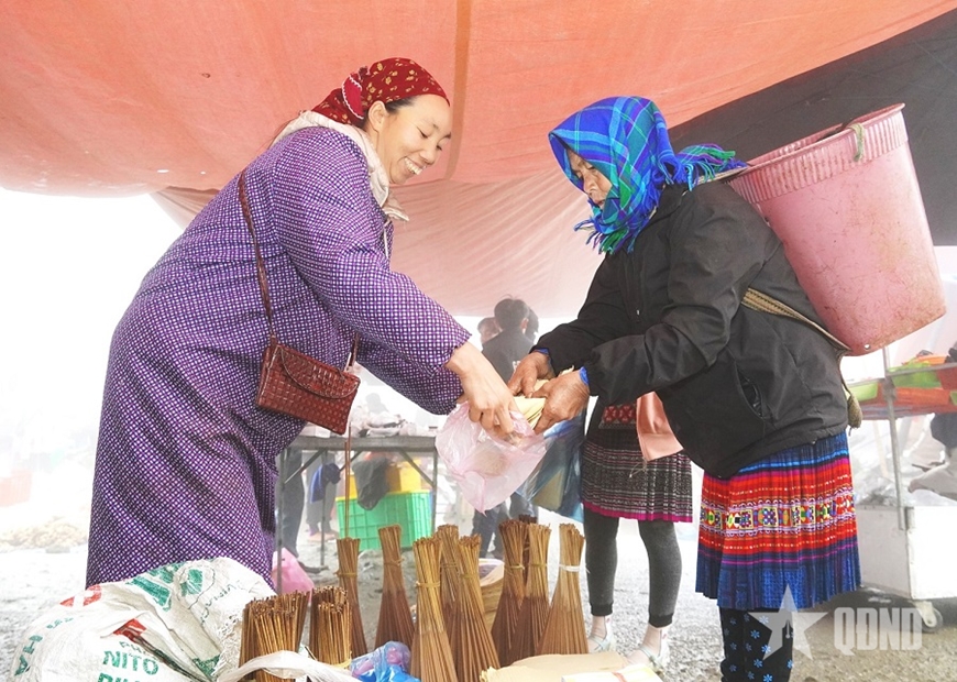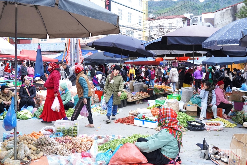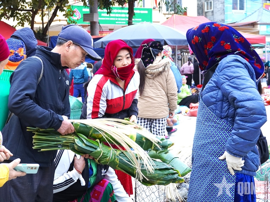 Từ tờ mờ sáng, khi sương còn phủ kín triền núi, bà con các thôn bản gùi theo nông sản, cành đào, lá dong, bó hương… đổ về chợ. Tiếng nói cười hòa cùng bước chân, sắc thổ cẩm chen giữa màu xanh rau rừng, làm nên bức tranh chợ phiên rực rỡ, ấm hơi người và thơm nồng “mùi Tết”, báo hiệu mùa Xuân đã về.