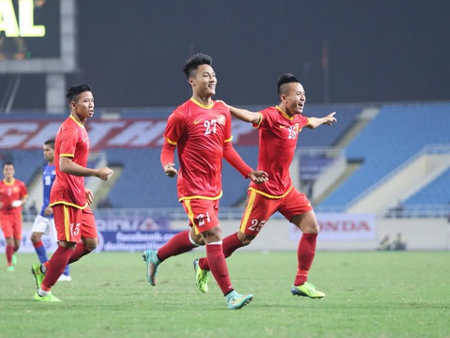 Hồng Quân ghi bàn thắng gỡ hòa cho ĐTVN. Ảnh: TT&VH