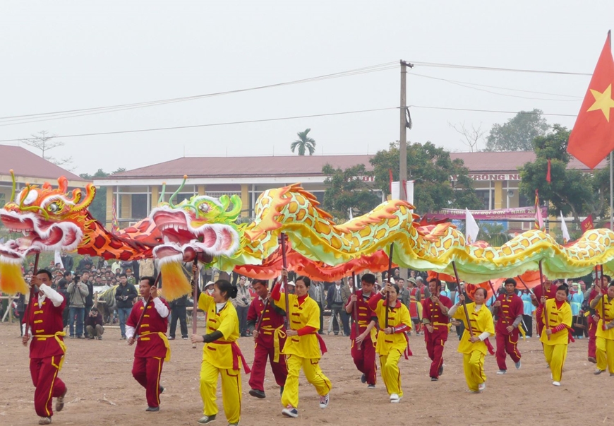 | Người dân phường Tiên Sơn, thị xã Duy Tiên, tỉnh Hà Nam (nay là phường Tiên Sơn, tỉnh Ninh Bình) múa rồng truyền thống tại Lễ hội Tịch điền - lễ hội tôn vinh nghề nông có bề dày lịch sử nghìn năm của dân tộc Việt Nam. Ảnh: THẢO NGỌC |