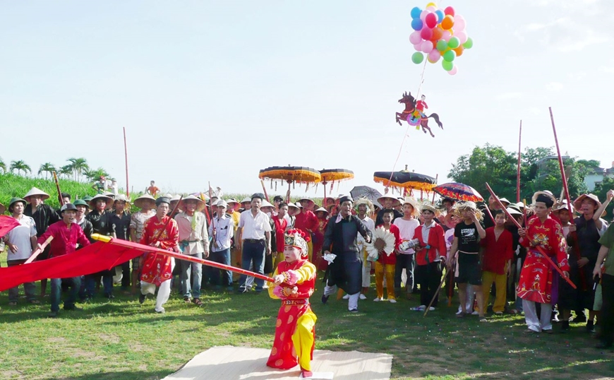 | Một nghi lễ độc đáo trong Lễ hội Gióng đền Phù Đổng (xã Phù Đổng, TP Hà Nội) nhằm tôn vinh truyền thống đánh giặc giữ nước bất khuất của tổ tiên, ông cha ta. Ảnh: THẢO NGỌC |