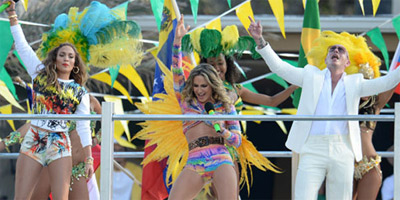 | Lô-pết (ngoài cùng, bên trái) gây chấn động dư luận khi không hát ở Lễ khai mạc World Cup 2014. Ảnh: Brazil2014. |