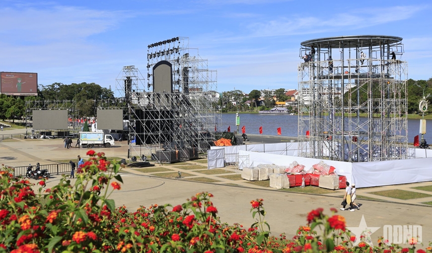| Sân khấu chuẩn bị cho Lễ hội cồng chiêng Đông Nam Á và chào đón năm mới 2026 trên Quảng trường Lâm Viên đã sẵn sàng. |