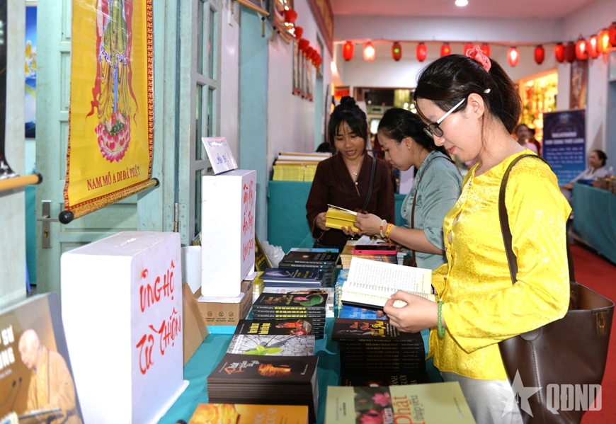 | Tham quan sách tại triển lãm “Quán Thế Âm Ngũ Hành Sơn - Hành trình Di sản và Tri thức”. |