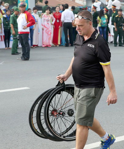 Chuyên gia kỹ thuật của đội Lào (LAO CCN TEAM) chuẩn bị bánh xe cho vận động viên từ rất sớm.
