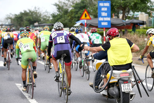 Đội mô tô tận tình phục vụ bộ phận tiếp tế của đội Lào (LAO CCN TEAM) tiếp nước cho vận động viên trên chặng thi đấu thứ 5, từ thành phố Quảng Ngãi (tỉnh Quảng Ngãi) đến thành phố Đà Nẵng.