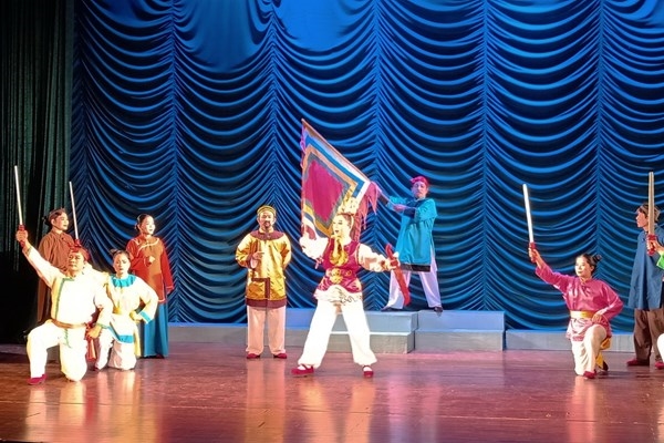 | Diễn trích đoạn tuồng "Trần Quốc Toản" tới khán giả học đường. Ảnh: baovanhoa.vn |