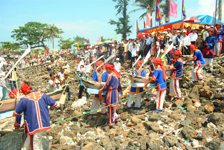Ngư dân đảo Lý Sơn thả mô hình thuyền cùng các hình nộm binh lính trong Lễ khao lề thế lính Hoàng Sa, nhằm tri ân dân binh trong đội Hoàng Sa năm xưa ra dựng bia, cắm mốc khẳng định chủ quyền. Ảnh: Đông Hà.