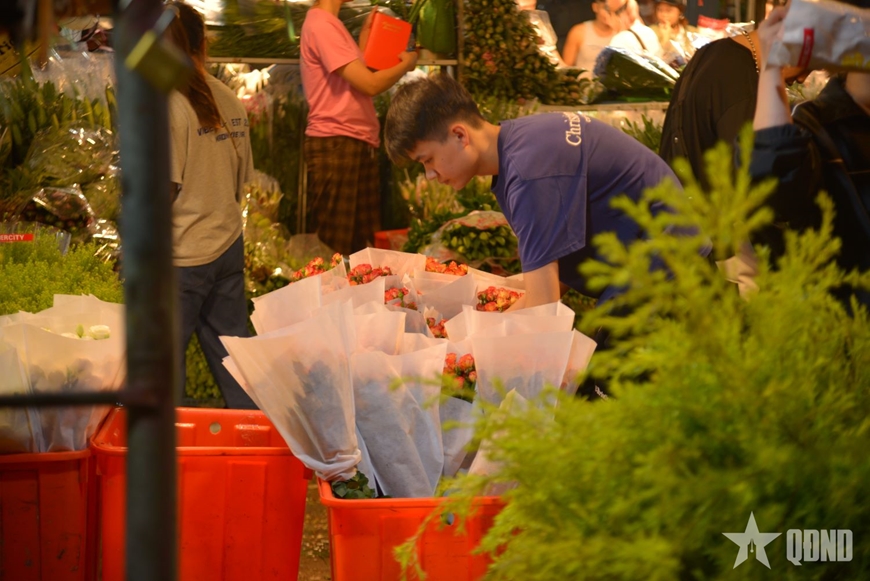 | Những tiểu thương “lành nghề” tỉ mỉ kiểm tra chất lượng từng cành hoa. |