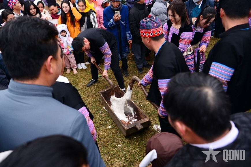 Giàng Mí Chơ, ở xóm Mượt, cho biết giã bánh là công đoạn quan trọng nhất, quyết định độ dẻo, mịn của bánh. Người giã phải đều tay, dứt khoát và phối hợp nhịp nhàng. Lúc đầu giã nhẹ để xôi kết vào nhau, sau đó tăng dần lực, giã liên tục đến khi khối bột trở nên quánh dẻo, bóng mịn. Nhìn thì tưởng đơn giản, nhưng để có được mẻ bánh ngon, người làm phải có kinh nghiệm và sự kiên nhẫn. Khi bột đã đạt độ dẻo cần thiết, mọi người nhanh tay ngắt bột, nặn thành những chiếc bánh tròn vừa phải.