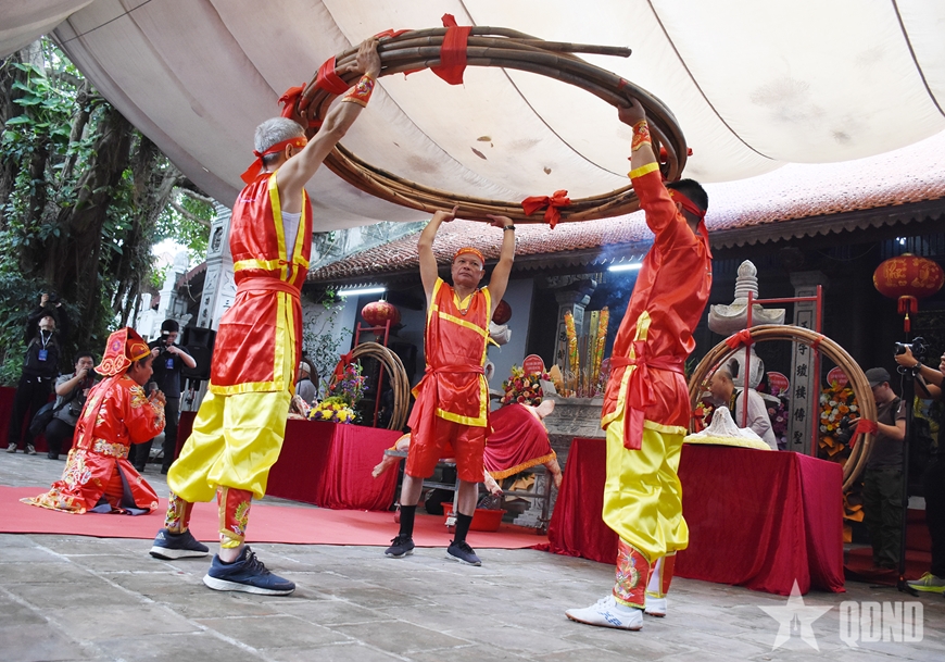 | Nghi thức tế lễ của đội kéo co ngồi đền Trấn Vũ. Ảnh: HOA LƯ |