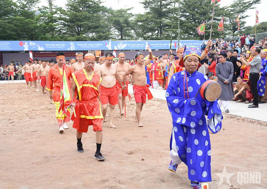 | Đội kéo co ngồi đền Trấn Vũ bước ra tranh tài. Ảnh: HOA LƯ |