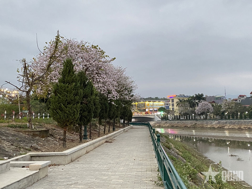 Một góc Phố đi bộ bên sông Nậm Rốm (phường Điện Biên Phủ) được phủ trắng bởi hoa ban.