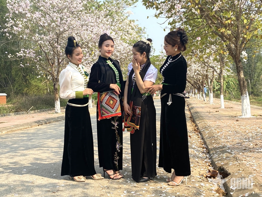 | Thiếu nữ các dân tộc chụp ảnh bên những cây hoa ban đang bung nở. |