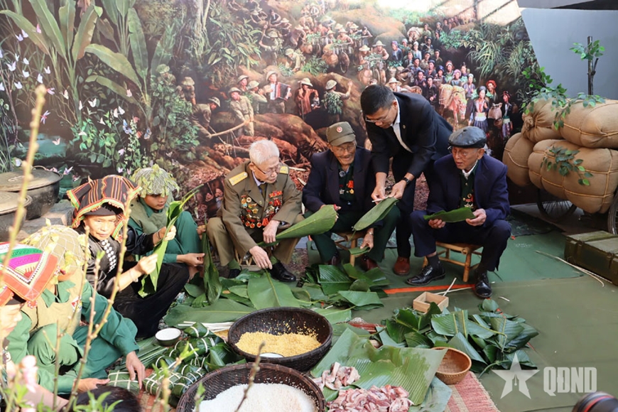 | Các cựu chiến binh, chiến sĩ Điện Biên tái hiện hoạt động gói bánh chưng. |