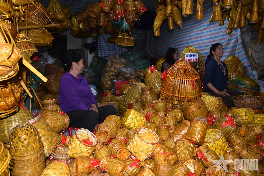 | Chị Bùi Hải Yến (bên trái) và Đặng Thị Bích Mai (bên phải) đến từ xã Hạ Bằng, TP Hà Nội về chợ Viềng từ sớm và sắm sửa những đơm, đó, giỏ... về treo trong nhà. |