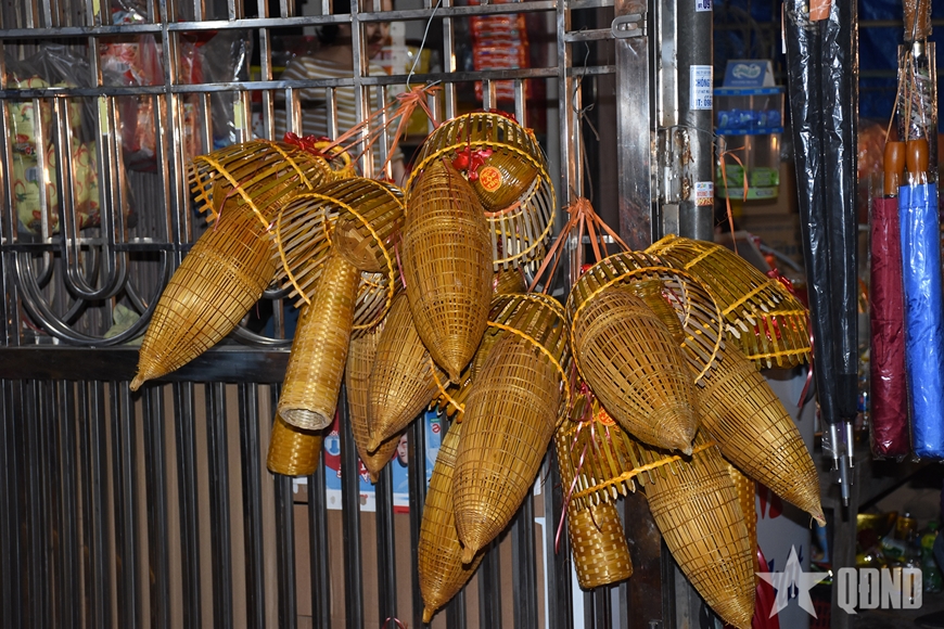 | Những sạp bán các dụng cụ đánh bắt thủy sản truyền thống bằng tre nứa hoạt động hết công suất. |