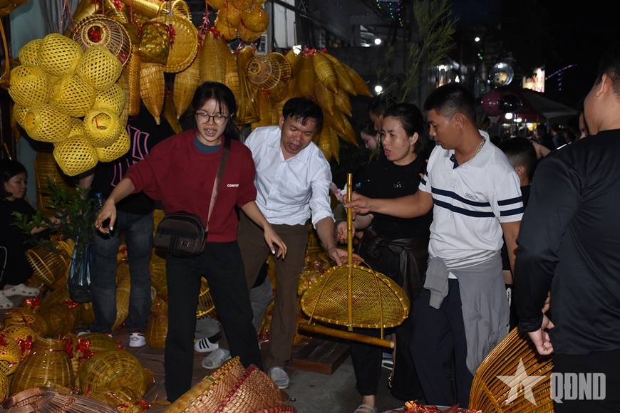 | Đoàn du khách đến từ xã Nho Quan (tỉnh Ninh Bình) thích thú với những sản phẩm đơm, đó, giỏ mini. |