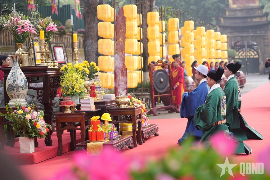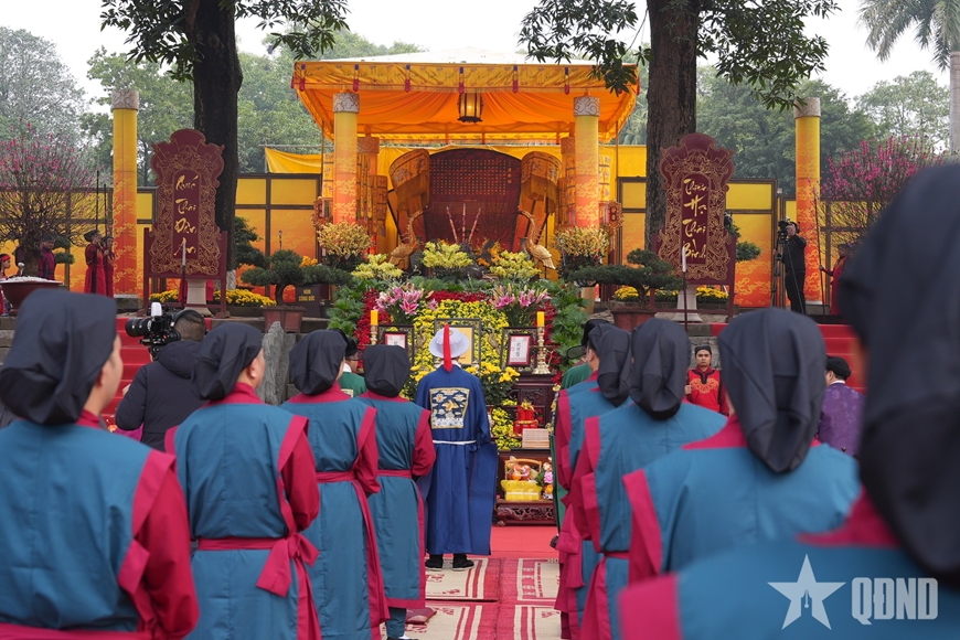 Trong làn khói trầm phớt nhẹ tỏa hương, từng bước chân của đội nghi lễ chậm rãi tiến ra sân rồng với áo mũ chỉnh tề, sắc phục rực lên dưới nắng xuân. Tiếng nhạc lễ trầm hùng hòa cùng nhịp xướng danh vang vọng giữa không gian cổ kính, khiến cả khoảng sân như lắng lại. Mỗi động tác dâng lễ, mỗi lần quỳ bái hay xoay mình đều được thực hiện theo điển thức xưa.