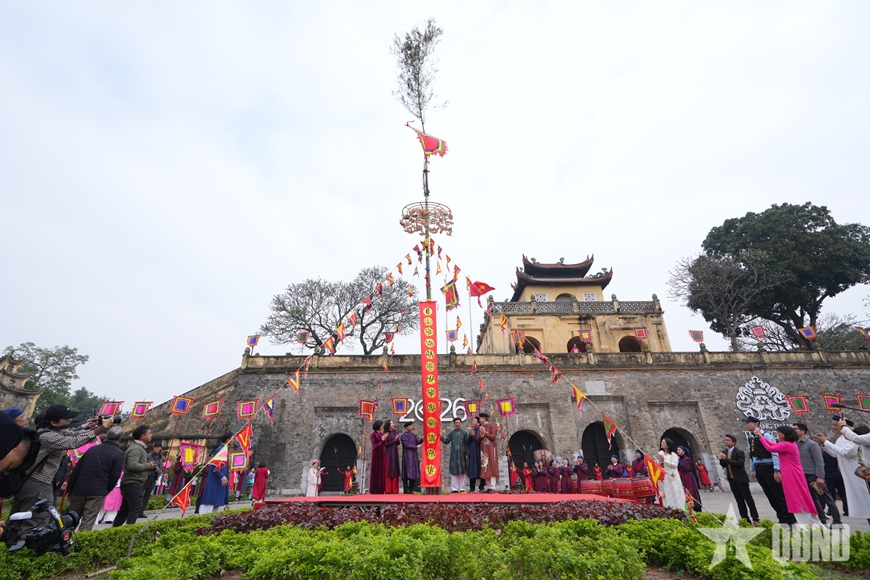 Hòa cùng mạch cảm xúc, lễ dựng nêu (lễ thướng tiêu) cũng được thực hiện theo nghi thức truyền thống. Trên ngọn những cây tre cao vút là vô số vật phẩm mang ý nghĩa tâm linh được treo lên như lá bùa, cờ ngũ sắc, chuông gió. Qua đó, việc dựng cây nêu mang ý nghĩa xua đuổi tà ma, bảo vệ gia đình khỏi những điều xấu xa và cầu mong một năm mới bình an, may mắn. Cây nêu được Trung tâm Bảo tồn Di sản Thăng Long – Hà Nội dựng lên từ 23 tháng Chạp âm lịch và sẽ hạ xuống vào mùng 7 tháng Giêng âm lịch, đánh dấu trọn vẹn một kỳ Tết.