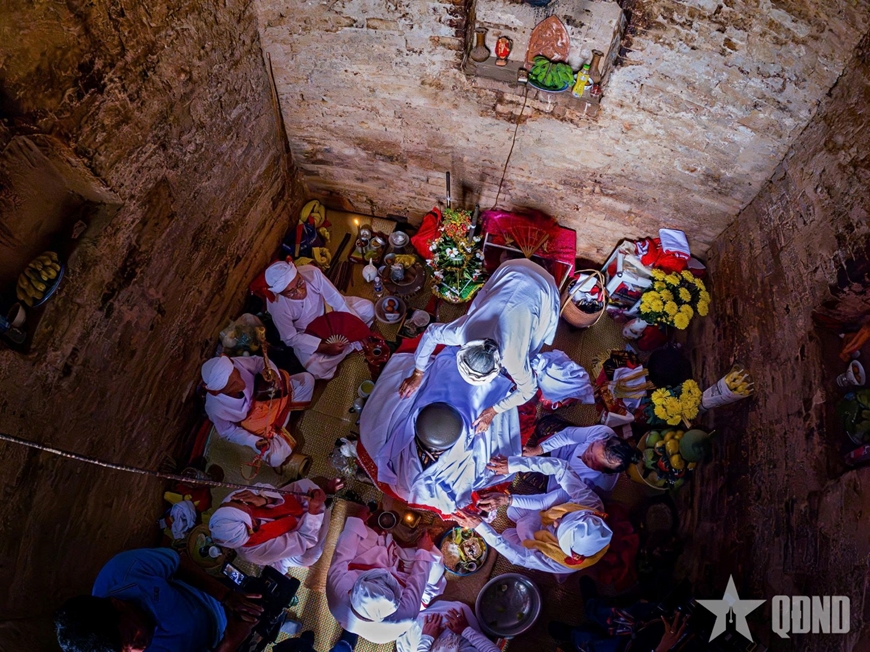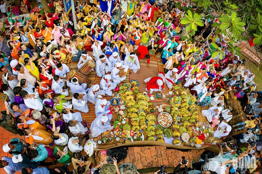 Người dân và chức sắc thực hiện các nghi lễ trong lễ hội Katê 2025 dưới chân tháp Pô Sah Inư. |