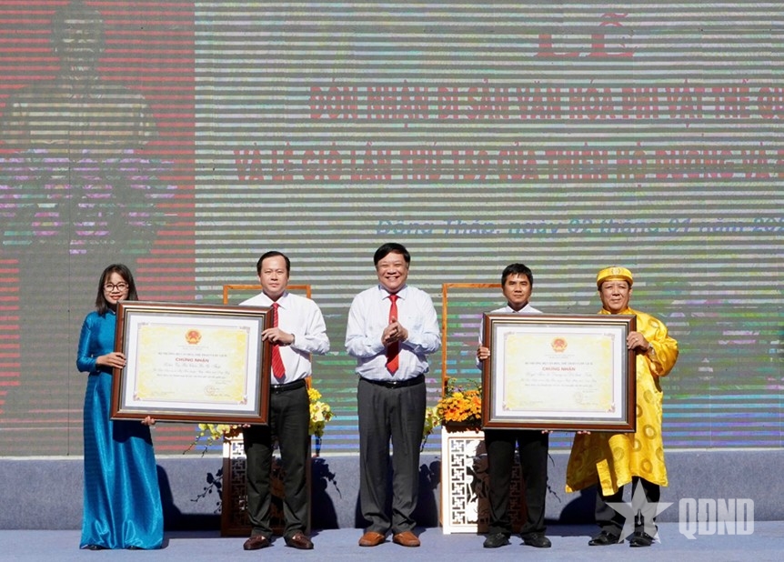Lãnh đạo tỉnh Đồng Tháp trao Bằng Chứng nhận Di sản văn hóa phi vật thể quốc gia. Ảnh: VIỆT TIẾN