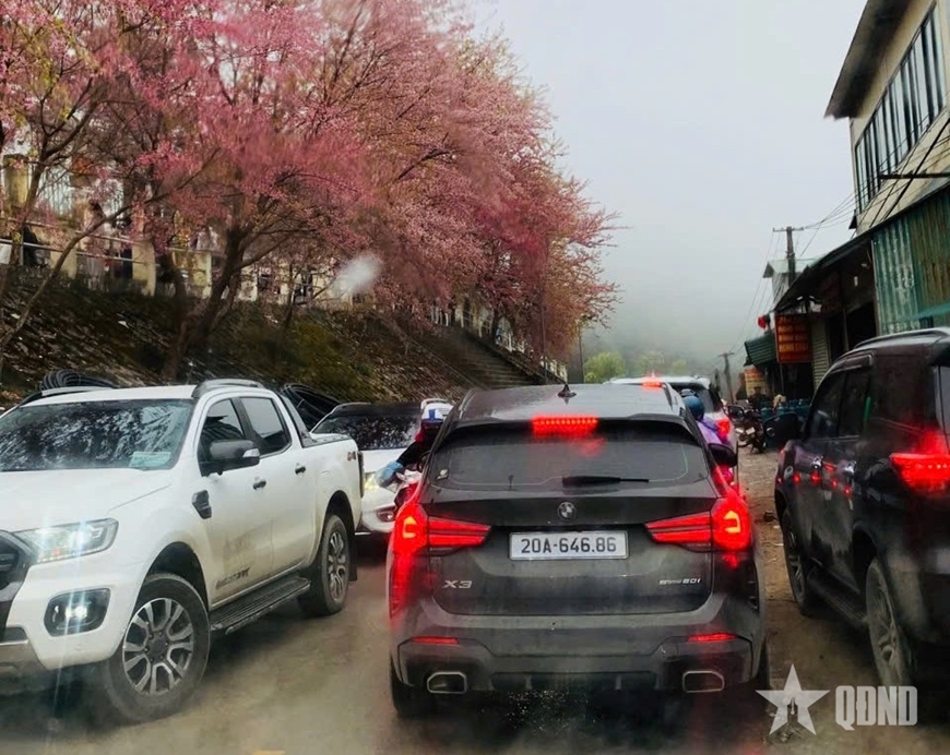 | Du khách tấp nập “check-in” dưới sắc mai anh đào nở rộ tại xã Lũng Cú (Tuyên Quang). |