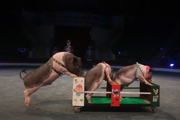 NSƯT Tống Toàn Thắng: Chúng tôi thấy rằng xu thế đưa vật nuôi lên sân khấu là rất tốt. Loài vật nuôi cũng không phải khó thuần hóa, huấn luyện. Chúng tôi đã lên kế hoạch chọn giống lợn để thuần hóa, đó là loại lợn khoang, lưng võng, hình dáng như lợn trong tranh Đông Hồ. Sở dĩ chúng tôi chọn loại lợn này bởi dáng đi ngộ nghĩnh. Từ cuối 2017 và trong năm qua, nhiều tiết mục xiếc lợn được chúng tôi đầu tư dàn dựng nâng cao hơn nữa. Liên đoàn Xiếc Việt Nam đã mua thêm một đàn lợn 7 con để huấn luyện, đáp ứng nhu cầu thưởng thức nghệ thuật của khán giả.