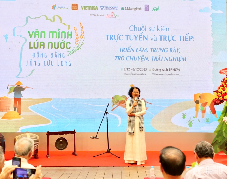 Phát biểu khai mạc, bà Quách Thu Nguyệt, Chủ tịch Hội đồng quản lý Quỹ Hoa Sen cho biết, chuỗi sự kiện “Văn minh lúa nước ĐBSCL” hướng tới khắc họa một góc nhìn sinh động về ĐBSCL qua tầng sâu văn hóa, con người và lịch sử; giúp công chúng hiểu rõ hơn hành trình mở đất phương Nam, cùng những cơ hội, thách thức đặt ra trong giai đoạn phát triển mới.