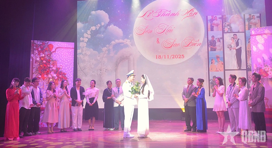 Trong khi đó, vở kịch “Đám cưới lính đảo” của tác giả Vũ Thị Thu Phong; Thượng tá, NSƯT Đới Anh Quân, Phó giám đốc Nhà hát đạo diễn để lại ấn tượng cho khán giả với nhiều cung bậc cảm xúc khi xoay quanh câu chuyện tình yêu giữa Hải - người lính công tác ở quần đảo Trường Sa và Biển - cô giáo nơi đất liền. Ngày cưới đến, Hải cùng đồng đội thực nhiệm vụ phòng, chống bão và cứu nạn, cứu hộ ngư dân trên đảo; tưởng rằng Biển và Hải phải tổ chức lễ cưới online, nhưng bất ngờ sau thời gian thực hiện nhiệm vụ và hiến máu cứu ngư dân, sóng yên biển lặng, Hải được trở về đất liền trong ngày trọng đại, mang theo bó hoa cưới kết bằng quả bàng vuông - biểu tượng của sức sống giữa biển khơi. Vở kịch ca ngợi tình yêu của người lính biển, sự hòa quyện của tình yêu đôi lứa trong tình yêu biển, đảo, tình yêu Tổ quốc.