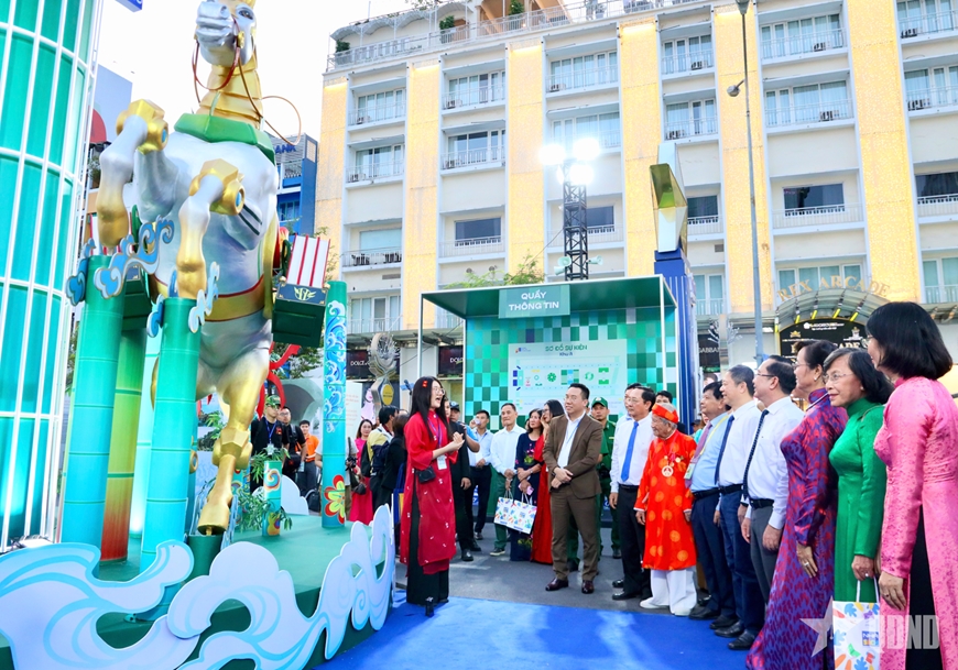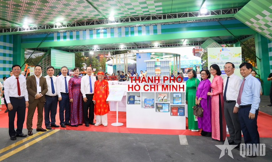 | Đại diện lãnh đạo TP Hồ Chí Minh và đại biểu tham quan không gian đường sách. |