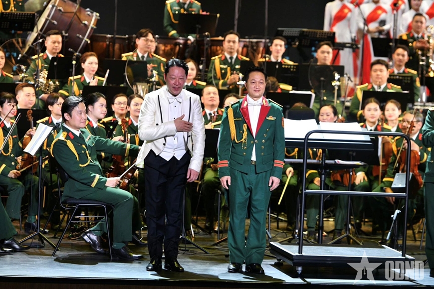 | Nhạc trưởng Lê Phi Phi và Đại tá, NSND Nguyễn Xuân Bắc đồng chỉ huy chương trình. |