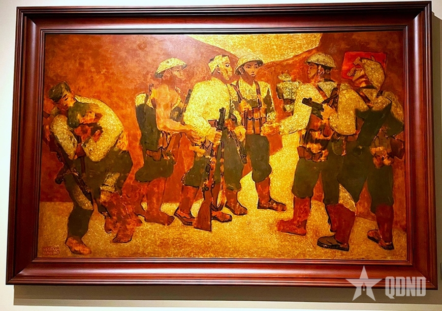 Bức tranh ghi lại khoảnh khắc kết nạp Đảng thiêng liêng ngay giữa chiến hào chật hẹp, nơi ranh giới giữa sự sống và cái chết. Trong hoàn cảnh khốc liệt ấy, lý tưởng cách mạng vẫn bừng sáng, khẳng định con người và niềm tin là cội nguồn làm nên Chiến thắng Điện Biên Phủ lẫy lừng.