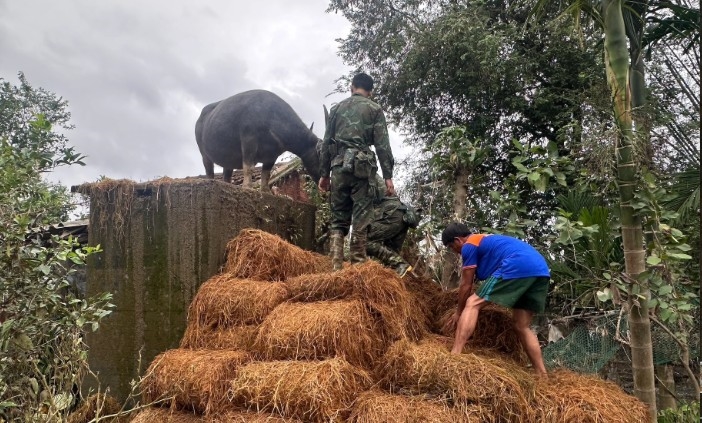Nhờ có mạng xã hội, anh Hội biết con trâu của nhà mình đang bị mắc kẹt trên mái nhà người khác mà không biết làm cách nào để đưa xuống đất. Sau đó, một nhóm chiến sĩ Trung đoàn 143 đến nhà anh Vũ, trực tiếp ôm từng bó rơm đặt cạnh nhà vệ sinh, xếp thành bậc thang, tạo thành lối đi chắc chắn rồi dắt trâu đi xuống.