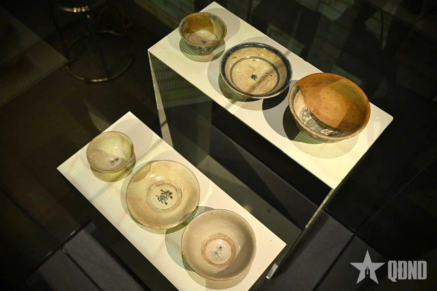 | Các hiện vật gốm nguyên gốc khai quật tại Hoàng thành Thăng Long trưng bày phục vụ du khách tham quan. |