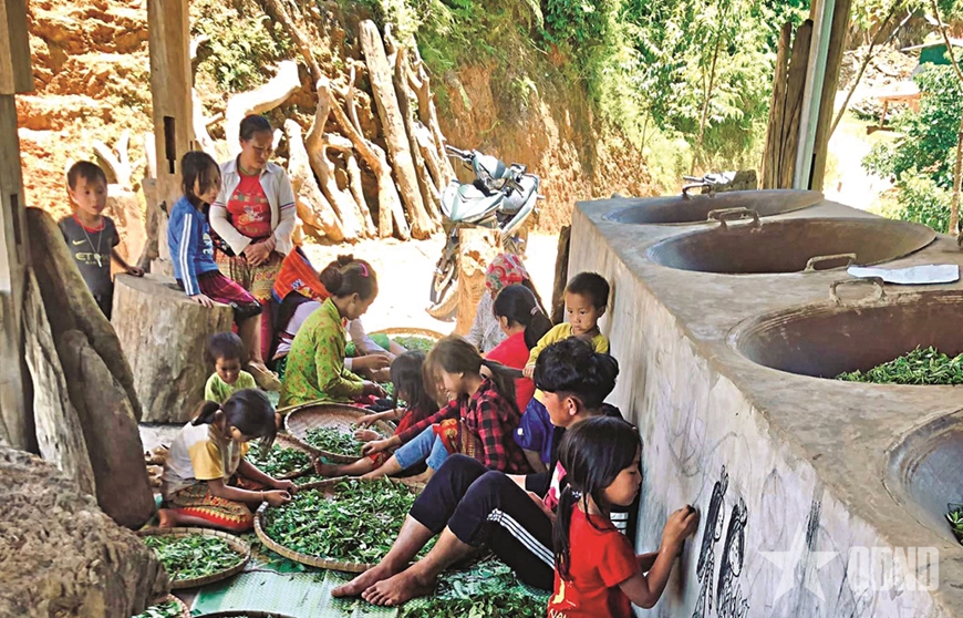 | Bà con trong làng cùng nhau sơ chế chè sau khi thu hoạch.  |
