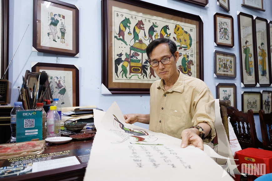 | Ông Nguyễn Hữu Quả là thế hệ thứ 13 trong gia đình có truyền thống làm tranh dân gian Đông Hồ. |