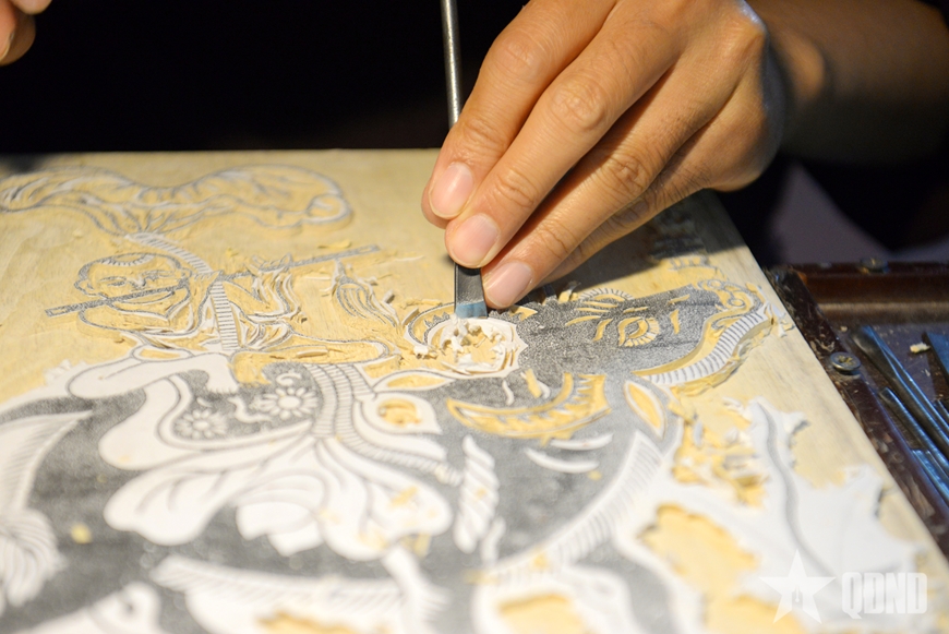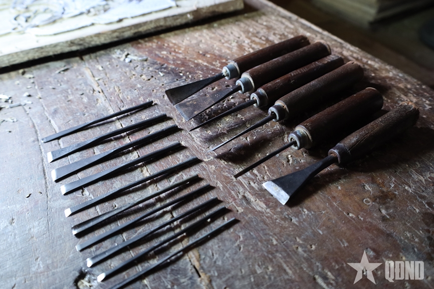 | Với khắc gỗ, người nghệ nhân sử dụng công cụ đặc trưng là bộ đục chuyên dụng. Mỗi nhát khắc đòi hỏi sự chính xác cao, bởi chỉ một sơ suất nhỏ cũng có thể làm hỏng cả một bản mộc kỳ công. |