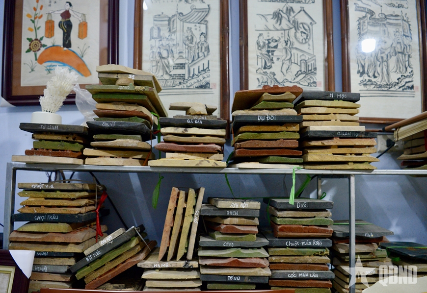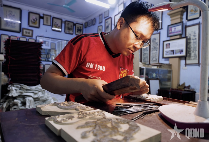 Anh Nguyễn Hữu Đạo, con trai ông Quả, đang miệt mài bên bàn khắc gỗ. Là người nối nghiệp cha mẹ, anh nói: “Từ nhỏ, tôi đã được sống trong gia đình có truyền thống văn hóa làm tranh Đông Hồ, tôi nắm vững về kỹ thuật in ấn, vẽ màu thủ công và đồng thời cũng có thể quảng bá sản phẩm trên các nền tảng số”.